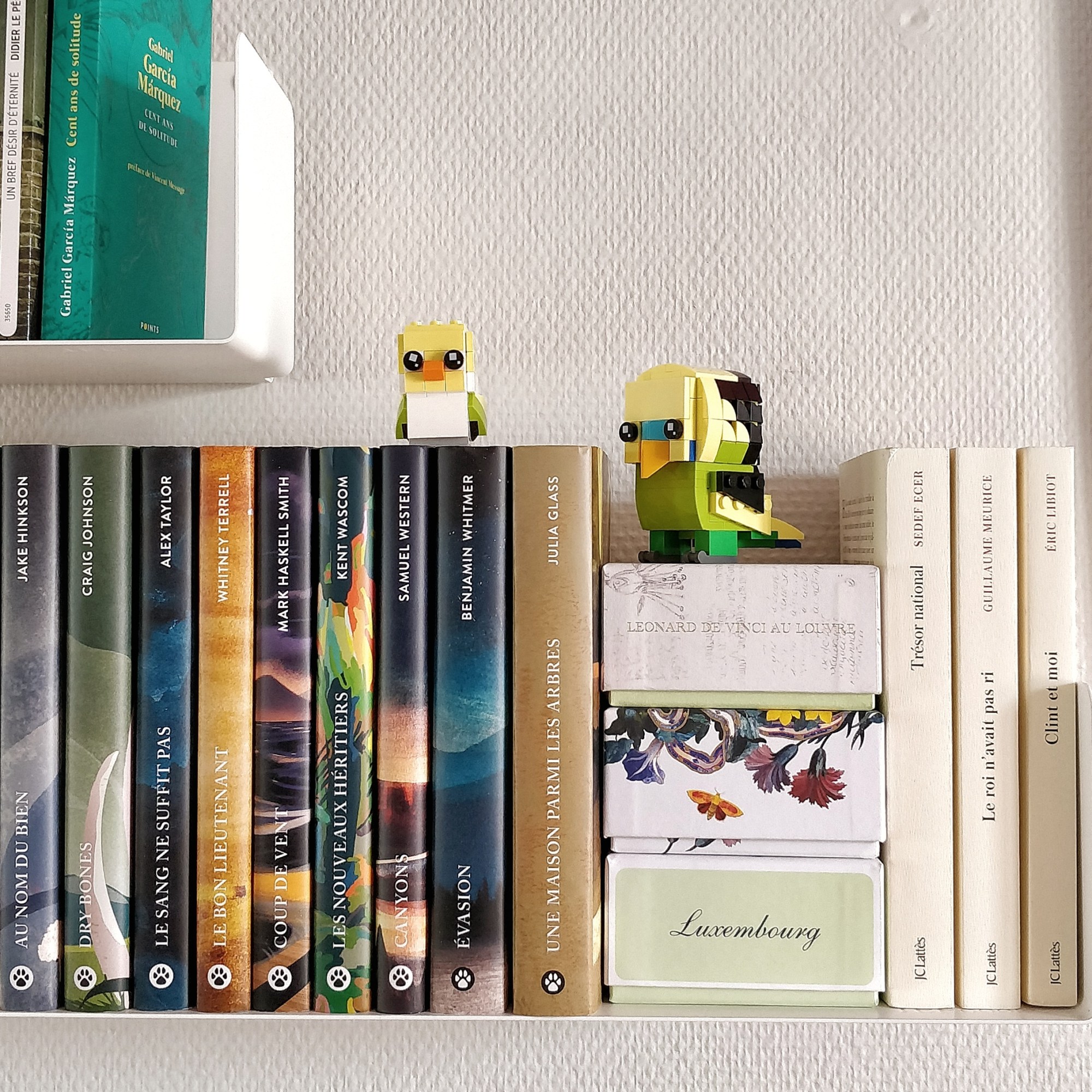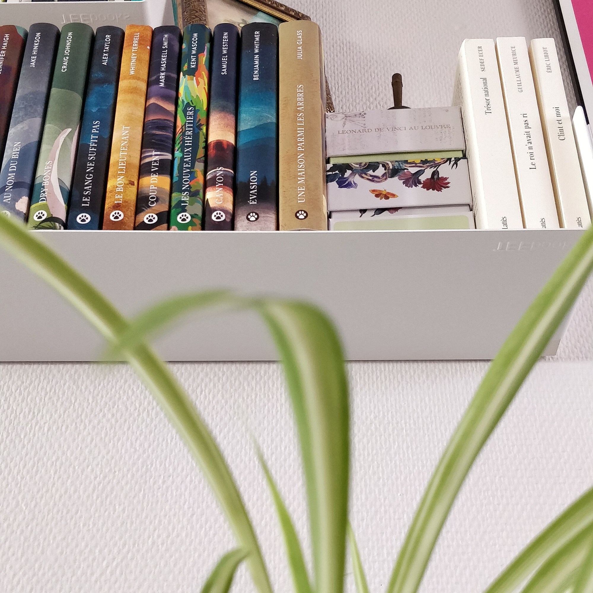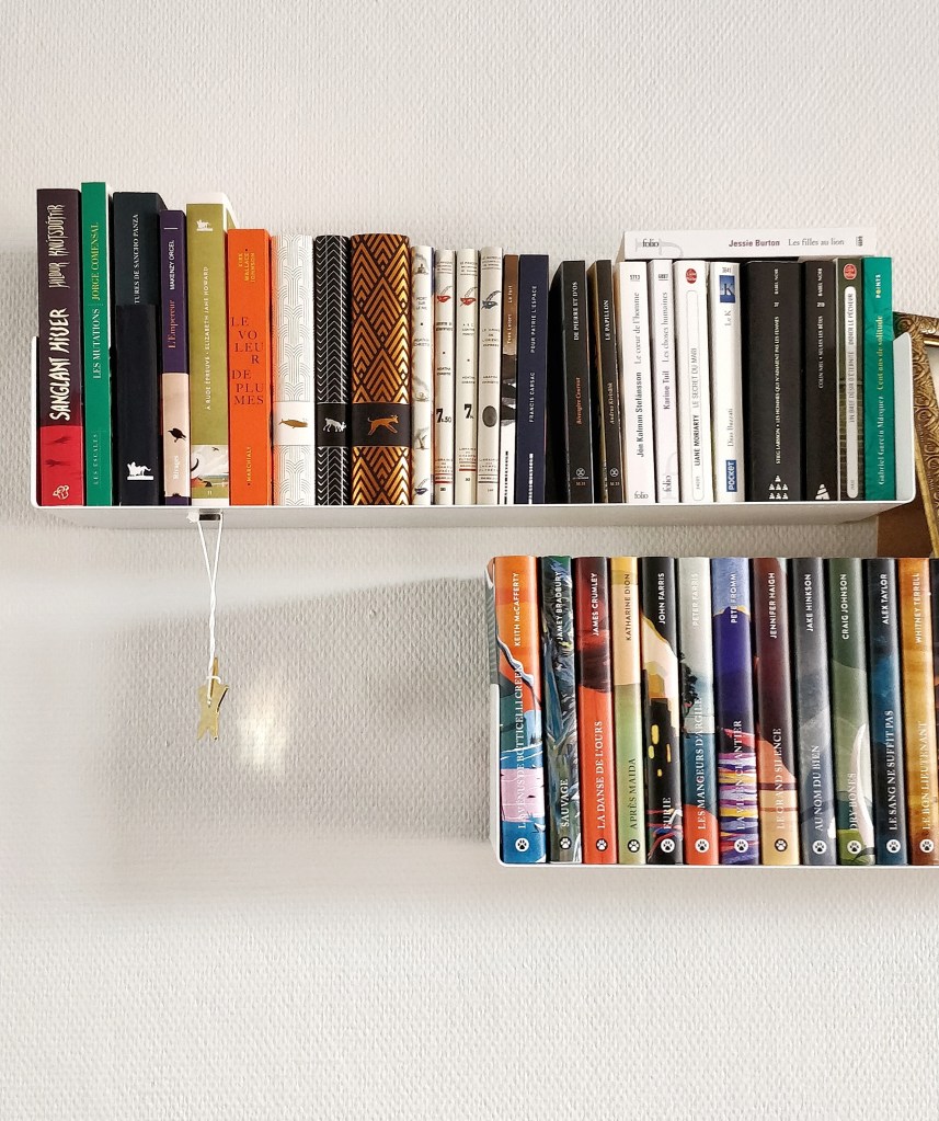 La qualité du matériau se sent en main, le poids n’est pas excessif pourtant l’étagère ne se déforme pas, et supporte un poids conséquent ! Le touché est lisse, doux, agréable. Les livres glissent dessus sans se corner à cause d’un accro, et les rebords de chaque côté permettent de bien maintenir les livres sans avoir besoin de presses livres. Je bouge beaucoup les livres présents sur l’une d’entre elle, mais aucun signe de fatigue de l’étagère, elle est bien appliquée dans le mur, ne bouge pas d’un pouce. Elles sont indispensables tout en étant pas ostentatoires, présentes on les voit, mais sans masquer ce que l’on y expose. Petit avantage bonus du métal, vous pouvez y accrocher des aimants pour décorer selon vos humeurs, et les enlever ou changer leur place au gré des jours !